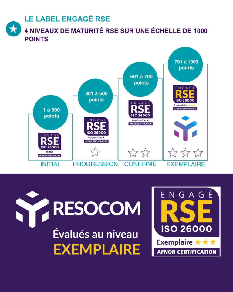 En 2025, RESOCOM a obtenu le niveau “Exemplaire” du Label AFNOR Engagé RSE,  la plus haute distinction du dispositif. Cette reconnaissance valorise :