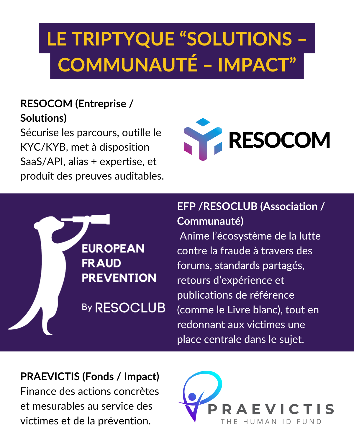 Dans ce même écosystème, PRAEVICTIS, The Human ID Fund permet de transformer l’engagement en actions concrètes : en finançant des projets d’intérêt général, le fonds soutient à la fois l’aide aux victimes et surtout le développement de solutions innovantes de protection de l’identité. Autrement dit, RESOCOM agit sur la sécurisation en amont, RESOCLUB organise la coopération, et PRAEVICTIS donne les moyens d’accélérer l’innovation utile au service de la confiance.